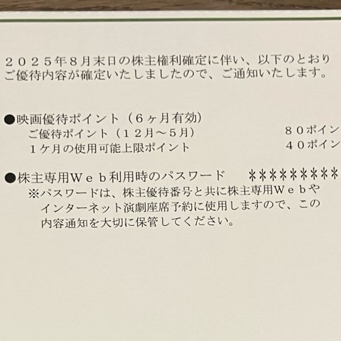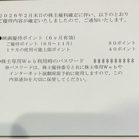 | 株数 | 映画優待ポイント | 演劇優待 |
