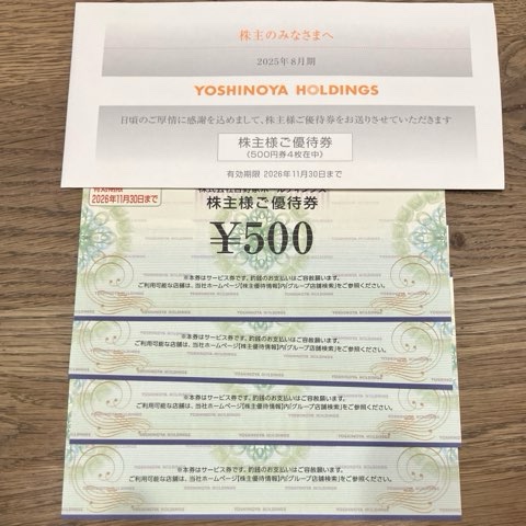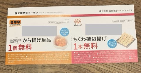 牛丼やうどんを食べることができる優待。8月末権利は、隠れ優待として吉野家とはなまるうどんのクーポン券が同封されています。