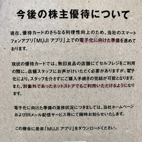 今後の株主優待についてのお知らせも入っていました。電子化・セルフレジ利用可能・ネットストアでも利用可能とこれは拡充と言ってもいいほど使い勝手が良くなります。