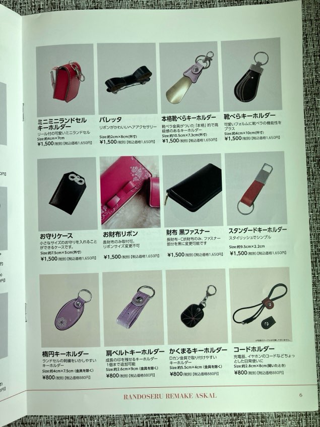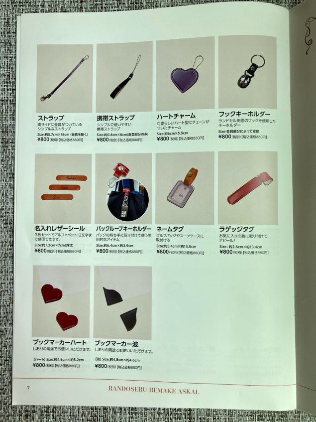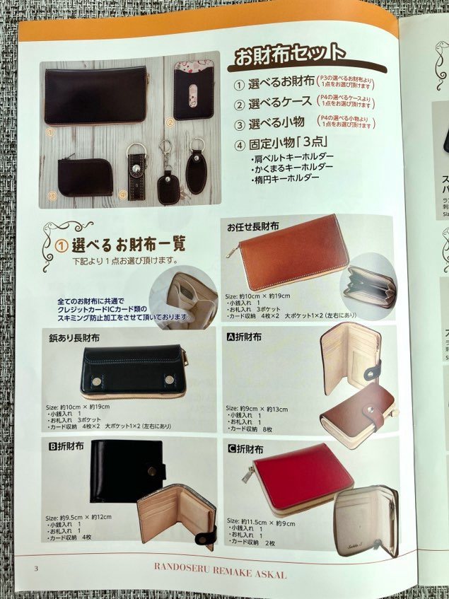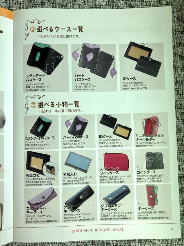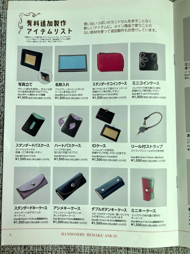 それぞれ好きなものを選択できます。財布の種類もいろいろあります。リメイク完成品をSNS投稿またはお友達紹介のお約束でミニランドセルも届きます。