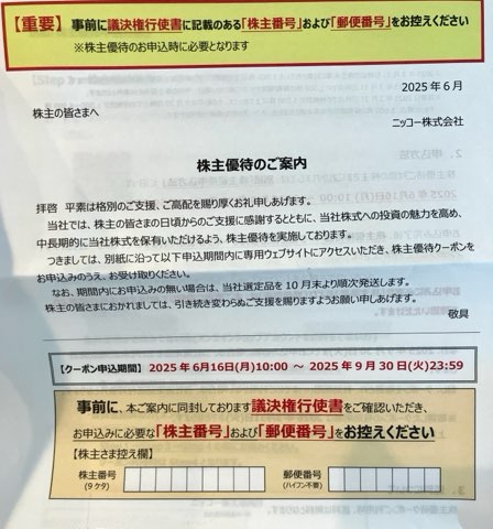 「株主優待申込方法」に沿って2025年6月16日〜9月30日までに専用サイトへアクセス、クーポンを取得