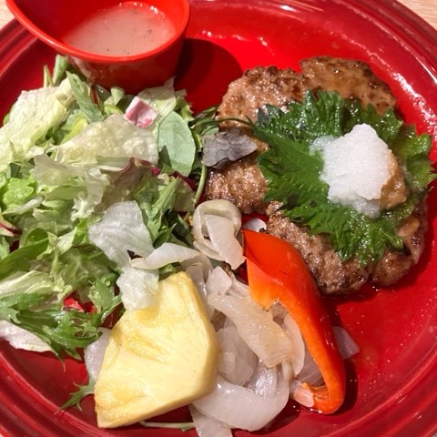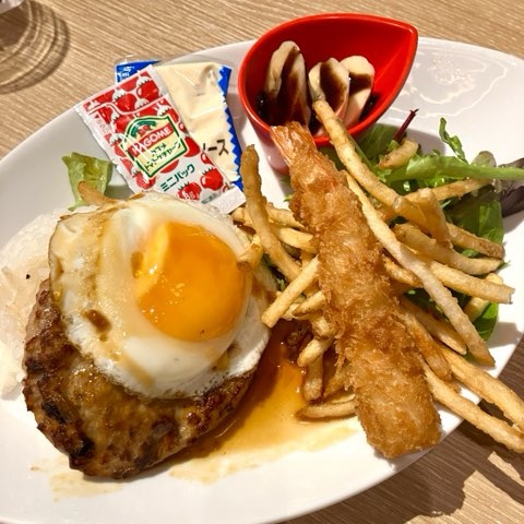 息子は食べたかったハンバーグに。旅行で野菜不足だったので、しっかりサラダもついてて嬉しい。ポテトにはケチャップもついていました。