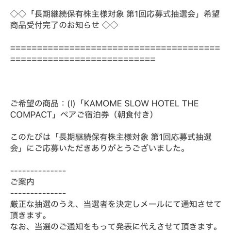 抽選についての案内がきたので応募。はずれ。これからも宿泊券狙いにします。