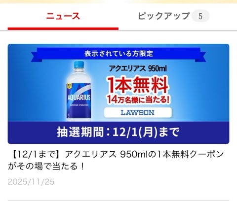 コークオンでポカリの抽選1日1回できます。はずれ。この間緑茶が当選したけど、よく行くローソンに置いてなくて交換できなかった。