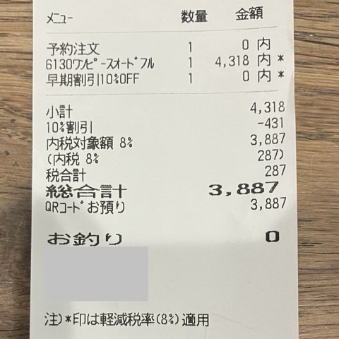 よく見ると、早期予約10%OFFは公式画像では3,886円ですが実際には3,887円でした。