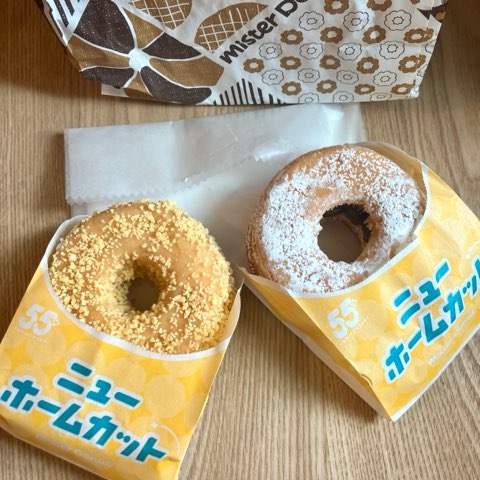 55周年の記念に、創業当時のホームカットが新しくなって登場!ホームカット、知らないし食べたことない…夫も知らない、なんなら両親も知らないって言ってた(たぶん田舎だから55年前にミスドがなかった)