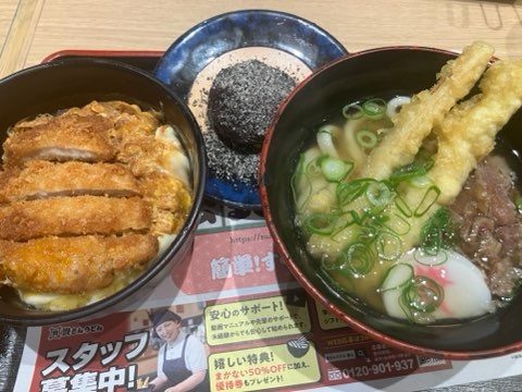 息子はミニかけうどん、夫はいつものように肉ごぼ天にミニ丼をつけていました。