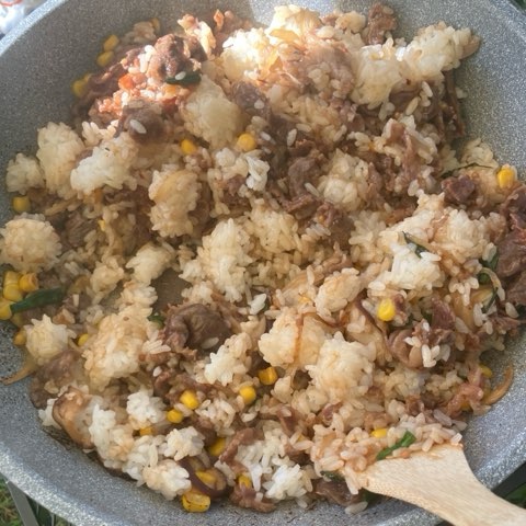 夕食は簡単にペッパーランチ。ジップロックに牛肉、コーン、ピーマン、しいたけ、玉ねぎ、ネギ、焼肉のタレを全部入れて、キャンプ場で炊いたご飯と炒めただけ。最後にバターで簡単。