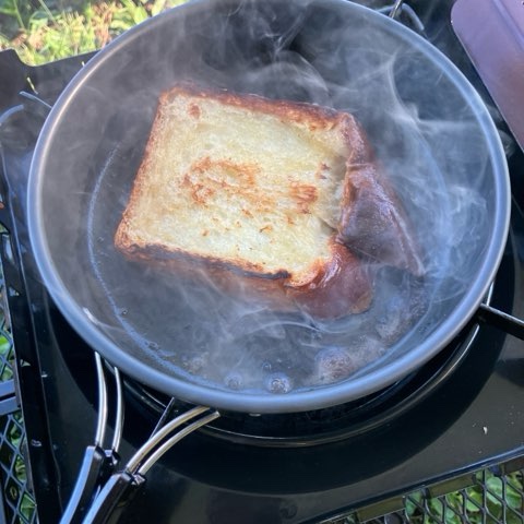 朝は寒かったのでホットコーヒーとコーンスープ。食パンはバター焼きにしてジャムをたっぷり。最高でした。