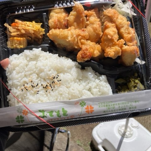 食堂ではできたてをお弁当に詰めてくれるので、そこで食べてもいいしテイクアウトして車内で食べてもOK。ごはん炊きたてで美味しい!鶏天も揚げたてで超美味しい!リピ確定。