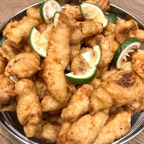 1本で鶏肉2.6kg分。10分の漬け込みで味がしっかりついて、鶏肉がめちゃくちゃ柔らかくなる。あとは天ぷら粉をつけて揚げるだけ。