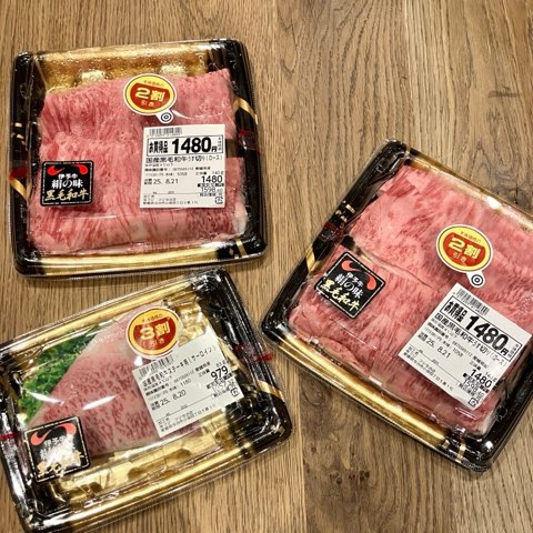ステーキ(3000円くらい)とすきやき肉(3000円くらい)を購入。