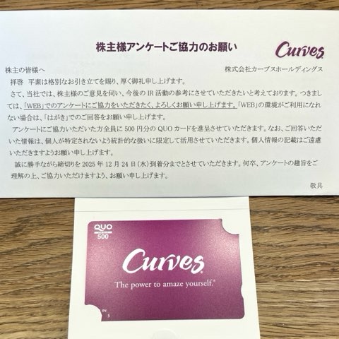 優待は100株で500円QUOカードですが、アンケート回答することでさらに500円QUOカードを貰えます!アンケート回答するだけで優待額が倍になります。