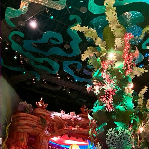 マーメイドラグーンのブローフィッシュ・バルーンレースが50分待ちと割と早く乗れそうだったので子どもたちだけで並んで乗りました。マーメイドラグーンは屋内なので、寒い時暑い時の避難場所としても便利。