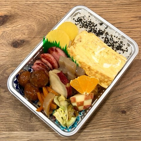 今日は冷蔵庫のあまりものでお弁当。大きい卵焼きがポイント