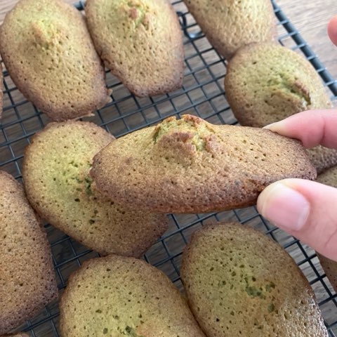マドレーヌはデベソになったら成功ーーー🐵 抹茶マドレーヌは娘の好物。バター、アーモンドパウダー、はちみつ、国産小麦、甜菜糖、抹茶、アルミフリーのベーキングパウダー。