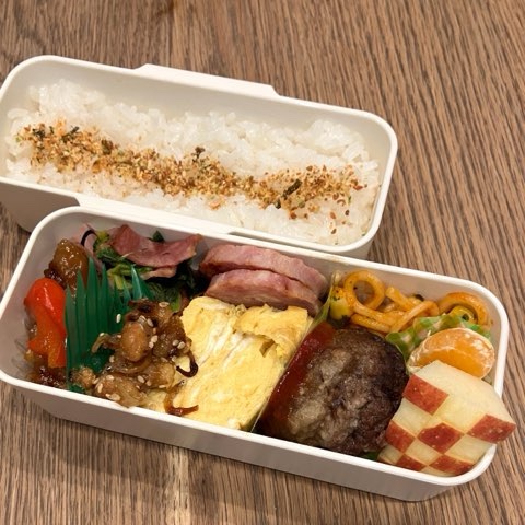 ご飯の量が少なめです🐵 酢豚・ほうれん草ベーコンソテー・雲仙ハム・出汁巻き卵・ハンバーグ・じゃこ大豆・冷凍パスタ・果物