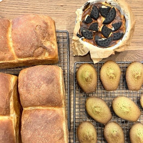 いつもの食パン3本(ライ麦2本両親用+自宅用1本)、抹茶マドレーヌ、オレオバスクチーズケーキ