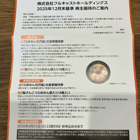 らあめん花月嵐のお食事券がもらえます。嵐げんこつらあめん食べてみたい!美味しいのかな?