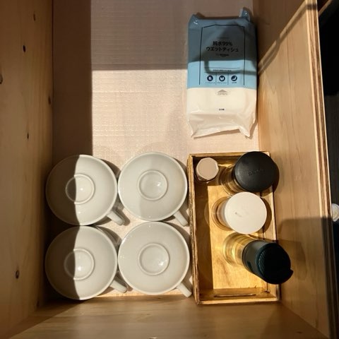 食器は下膳ケースがあり、20時すぎ頃にスタッフの方が取りに来てくれるので、洗浄不要です。
