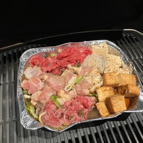 野菜類は家でカットして持参。我が家はボリューム出すためにすき焼きに厚揚げ入れます。鶏肉も持ってきました。ダイソーで購入した使い捨てのアルミプレートを使用