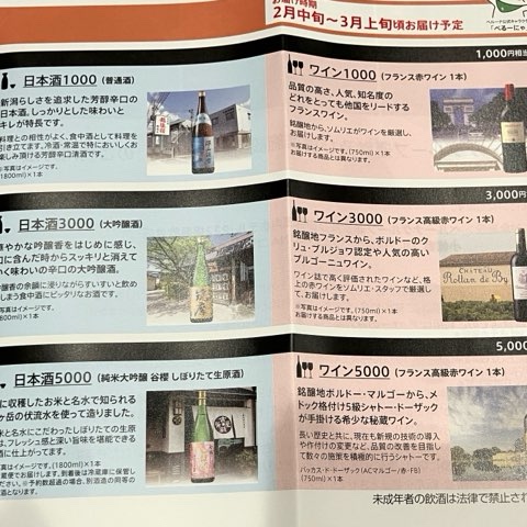 毎回ワインか日本酒を選択。プレゼントにもできるし、料理用にもできるのでストックしています。