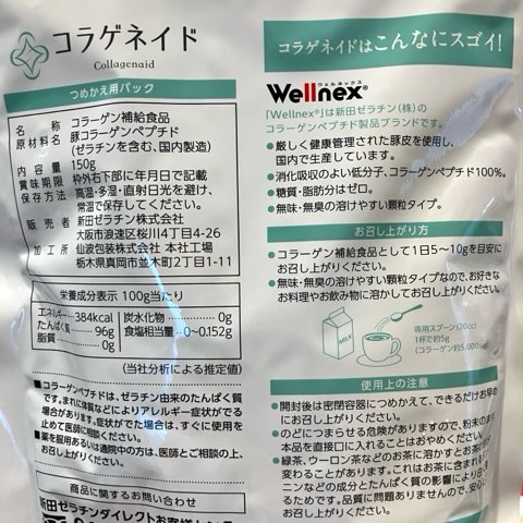 3年以上になると、コラゲネイドHG90gになります。コラーゲンペプチド+6種の成分を配合しているようです。