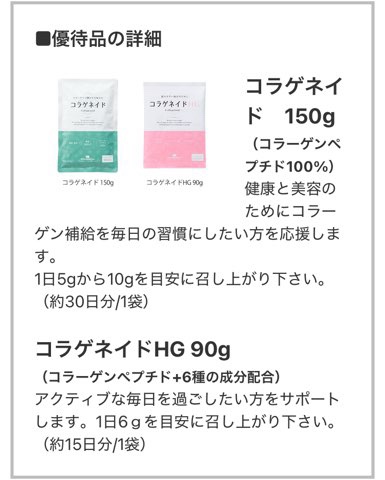 | 500株以上 | コラゲネイド150g+HG90g(6,500円相当) | コラゲネイドHG90g2袋(7,000円相当) |