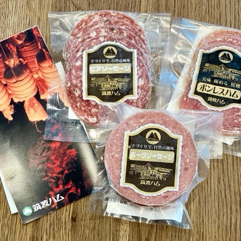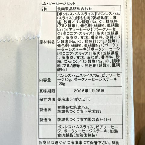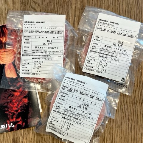 ボンレスハムスライス70g、ポークソーセージステーキ120g、ビアソーセージ80g