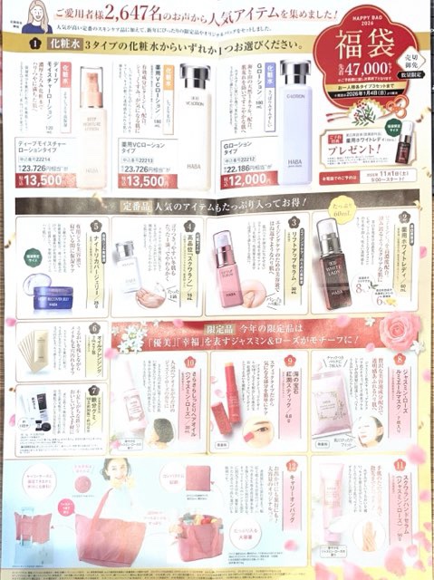 福袋に入っているのは、化粧水や美容液も入れてなんと12点!予約特典を入れると13点
