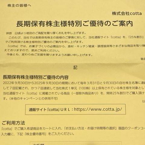 - 優待:9月/通販サイトcotta割引クーポン(100株)〜