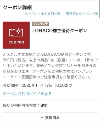 100株以上 「LOHACO」2,000円分(500円×4枚)割引クーポン