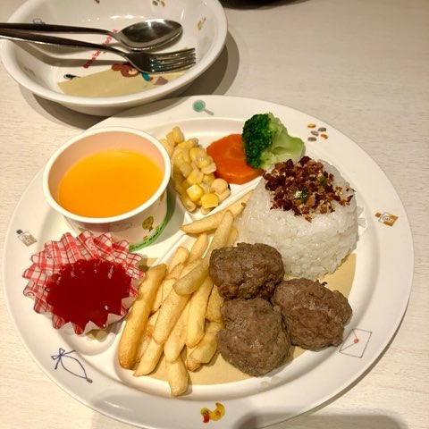 ハンバーグは粗挽きでかなり肉々しいですが、柔らかいハンバーグが好きな子どもたちにはちょっと不評でした。お値段がそこそこするので満足感は高め!優待利用できるので、節約しながらディズニー気分が盛り上がりました。