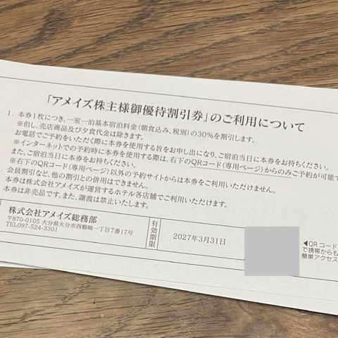 優待券の裏にQRコードがあり、読み込むと優待券専用サイトに移動します。ネット予約ができるようになって嬉しい!